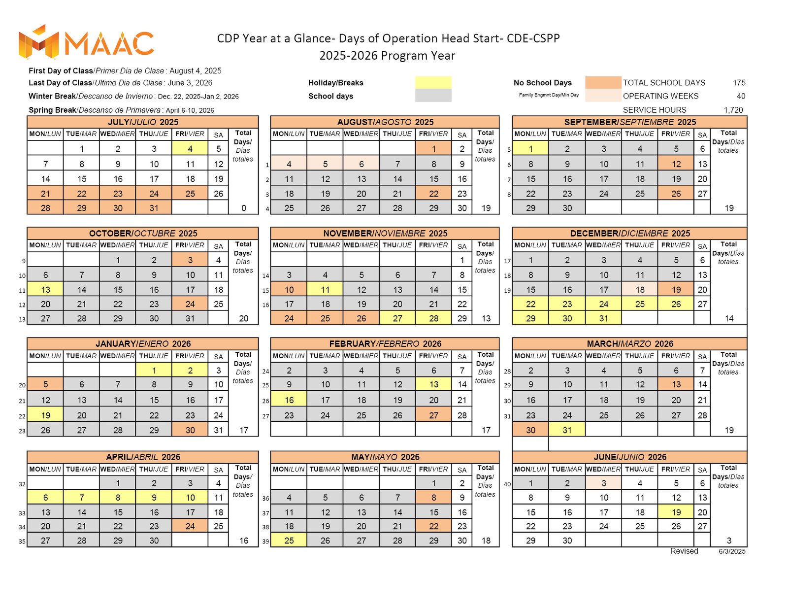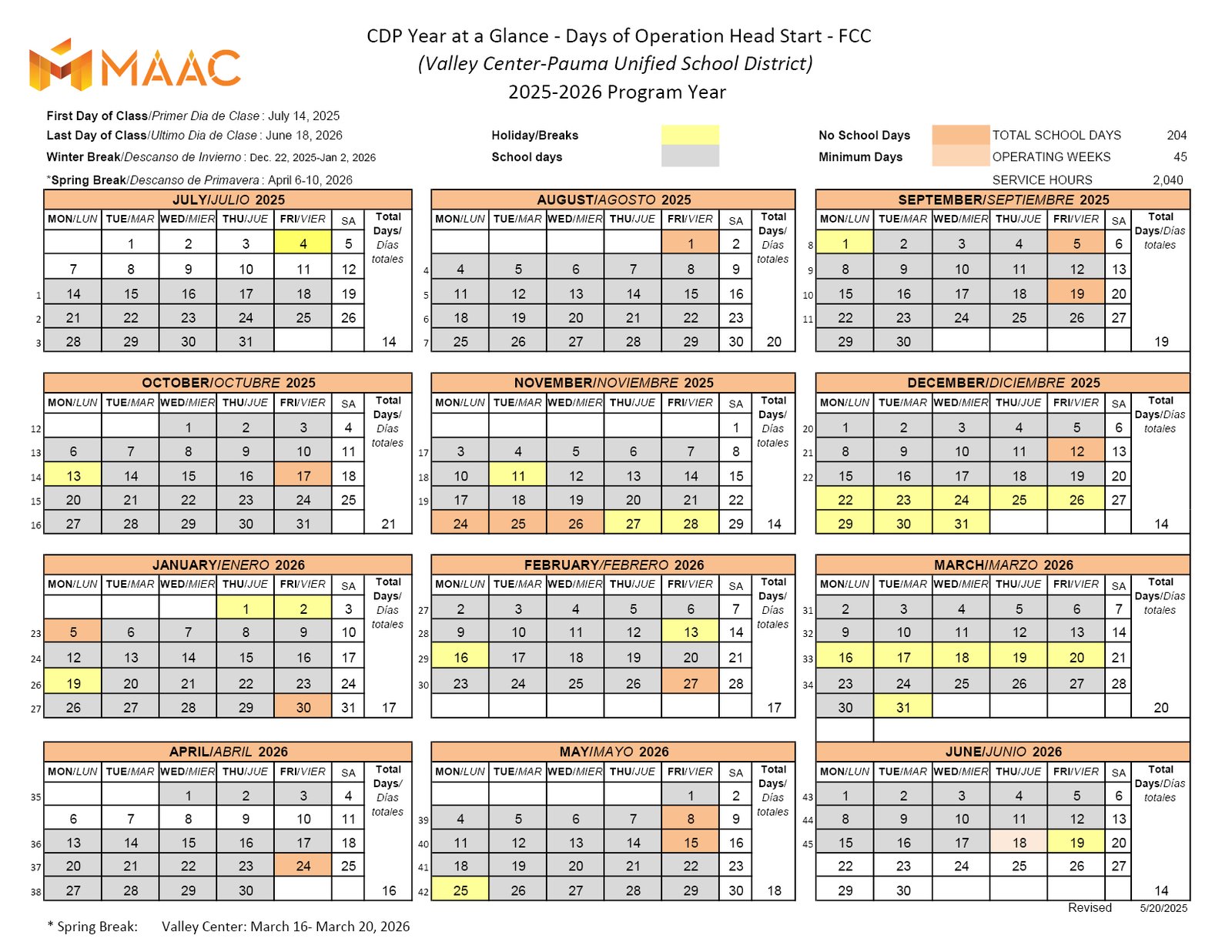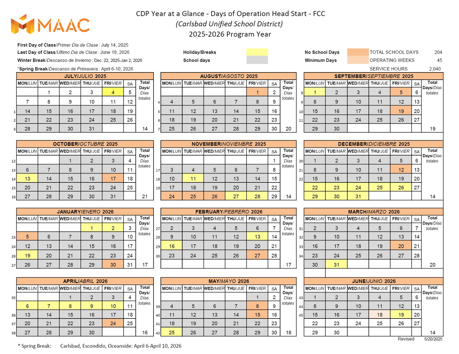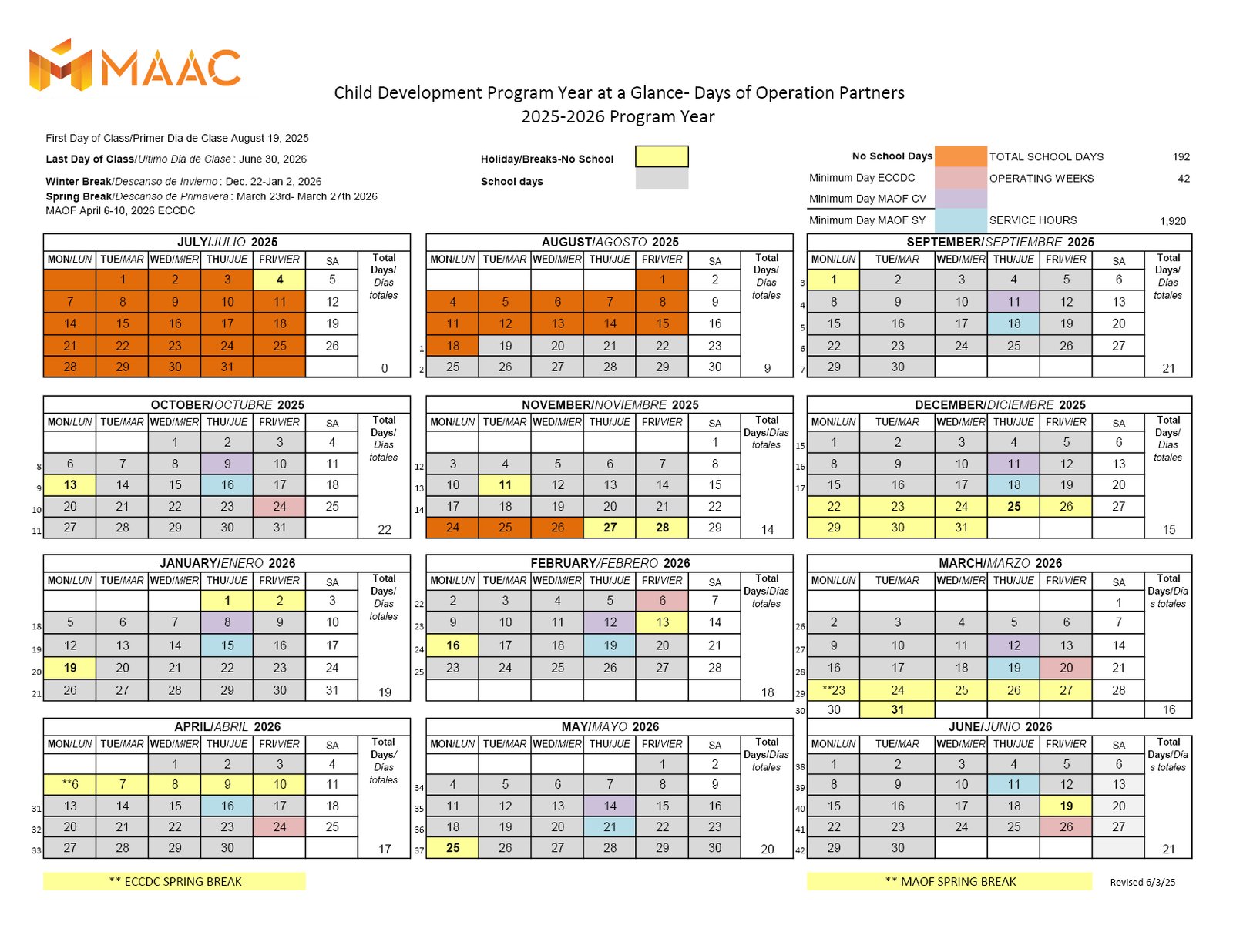 The FCC School/No School Days Calendar varies by district–please contact your FCC Provider to confirm which district your program follows.